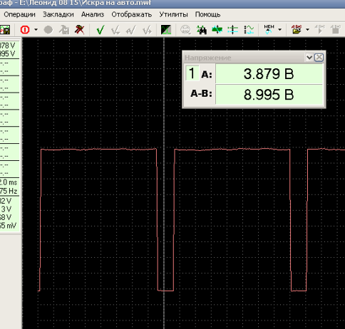 А вот, при подключении ещё и приборки, Эмулятор уже не справляется - он " не может" посадить опорное на массу, из-за чего низкий уровень повышается, т. е. "задирается" нижняя полка почти до 4 вольт. (Приборка VDO, ток потребления ок. 10 ma).