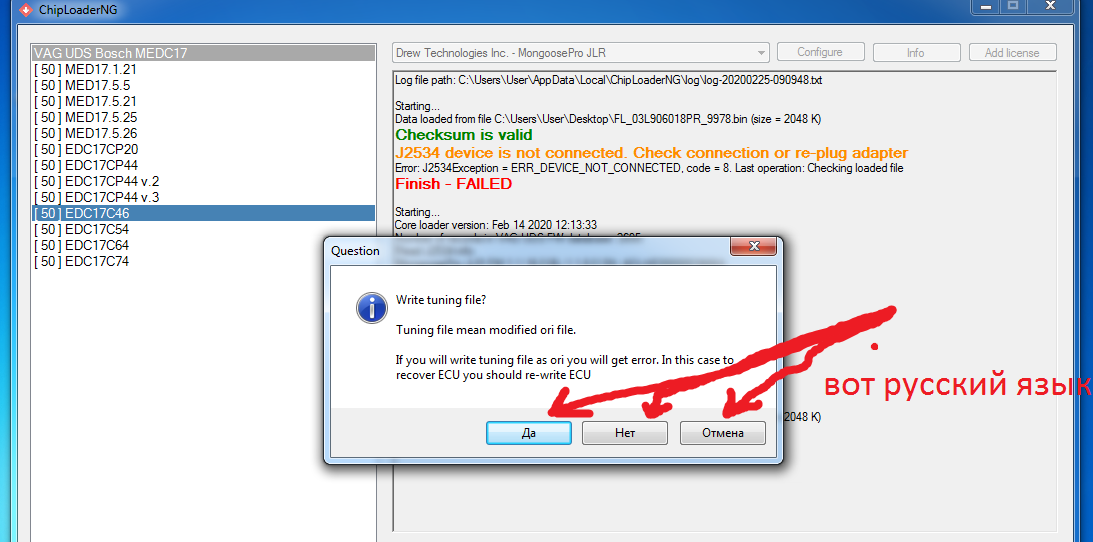У вас версия драйверов последняя - 1.4?Mikki писал(а): ↑Сб фев 29, 2020 5:32 pmПриветствую! После ознакомления с новой версией программы ChipLoaderNG и её работы с Чипософтом МИД , стало ясно ,что танцы с бубнами продолжаются ,а то есть при любой ошибке в работе программы,такие как не правильно выбран адаптер и др. ,нас будет ждать подобное сообщение : Read J2534 info