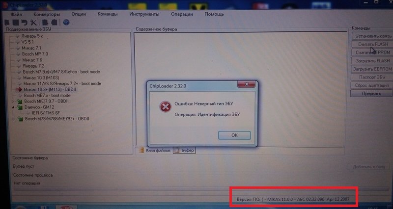 Мат часть нужно читать. Все верно : "В некоторых случаях, при попытках установить связь с ЭБУ может возникать ошибка "Неверный тип ЭБУ". Ошибка означает, что либо неверно выбран тип ЭБУ, либо идентификаторы ЭБУ были испорчены другим загрузчиком. Для решения проблемы с испорченными идентификаторы можно отключить контроль проверки типа ЭБУ. Делается это путем установки значения параметра Реестра HKEY_CURRENT_USER\Software\Chipsoft\ChipLoader\SetupParams\cCheckECUType в 0".