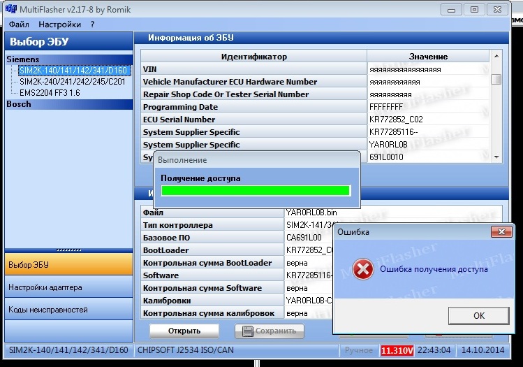Siemens SIM2K-140/141/142/341/D160 чтение flash-памяти через разъем ЭБУ, запись через диагностический разъем OBD-II.