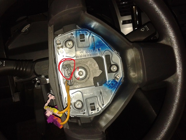 Все добра. Не работает сигнал на свеже с рук купленном авто. Сняв подушку обнаружил ..ничего (см.фото). Может кто располагает информацией распиновки разъема (обведен красным маркером)