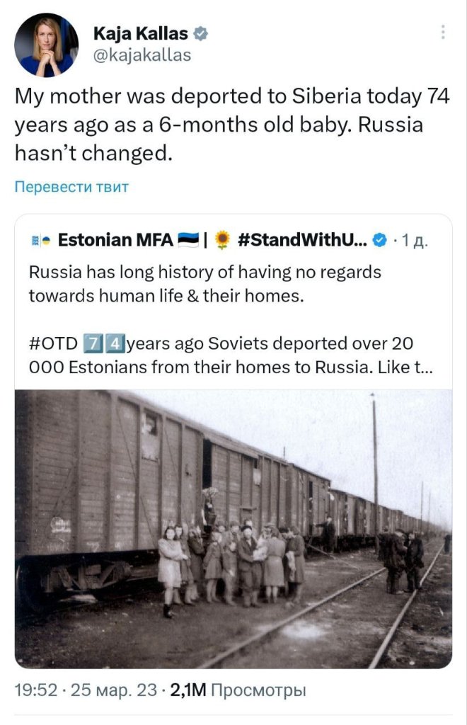 "Моя мать была депортирована в Сибирь сегодня, 74 года назад, в возрасте 6 месяцев. россия не изменилась", — написала премьер-министр Эстонии Кая Каллас в своем Twitter.