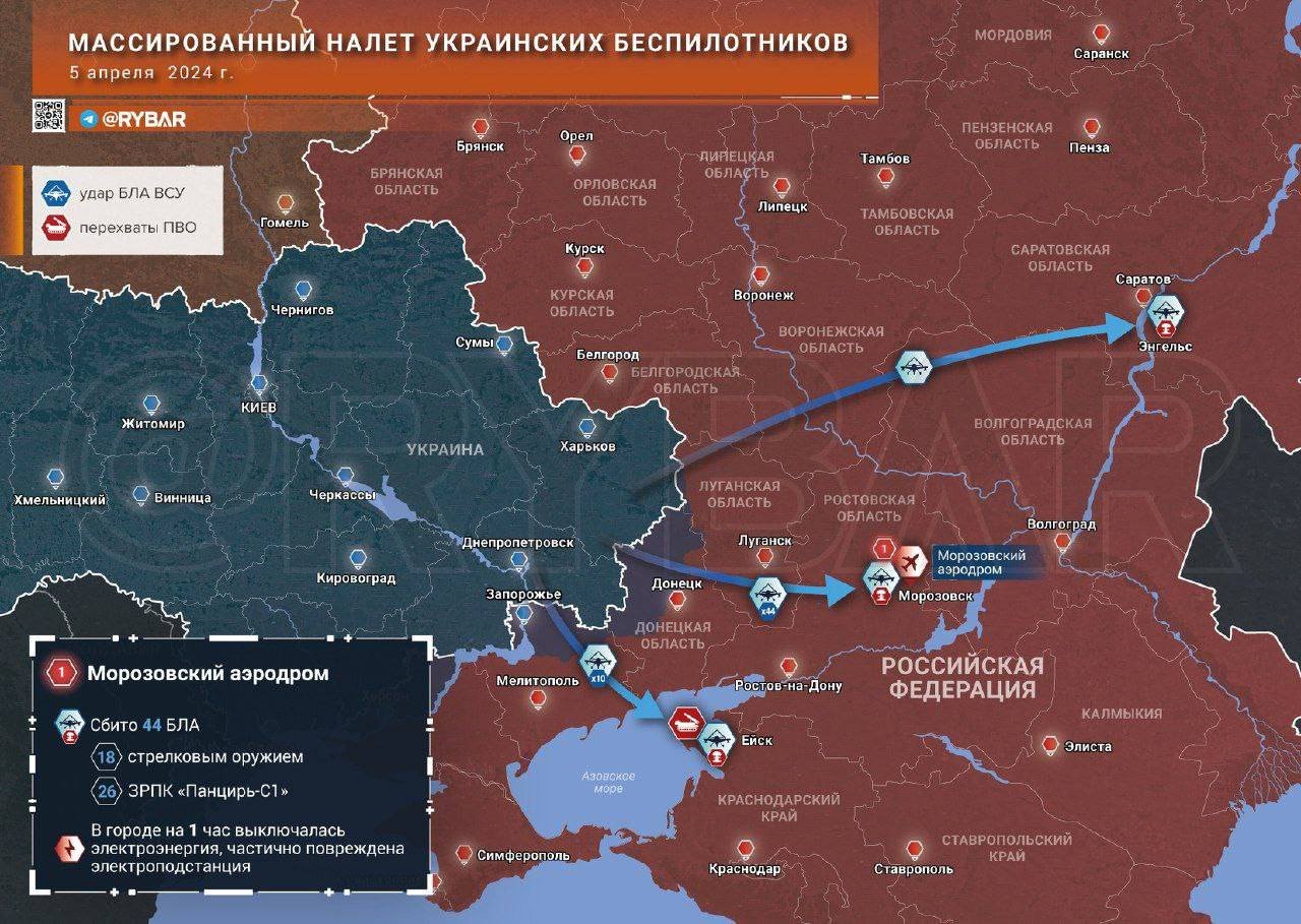 Основной удар пришёлся по аэродрому Морозовск в Ростовской области, куда украинские формирования направили 44 дрона. Точный тип неизвестен, он будет понятен при изучении обломков, однако с высокой долей вероятности это те же самые БЛА, что противник использует в последние недели.