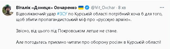 По данным издания, бой до сих пор идёт — сборную солянку из боевиков запрещённой РДК, 22-й ОМБ ВСУ и бойцов теробороны отбросили за границу РФ и прямо сейчас добивают с помощью артиллерии и авиации. Противник разбился на малые группы и рассредоточился в посадках Шосткинского района Сумской области.