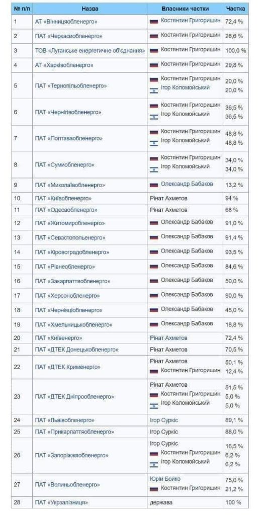 Владельцы энергетики Украины.Согласно списка это российские олигархи.Поэтому они,вместе с российскими американскими генералами половина войны не бомбили энергетику.И КВАРТАЛ-95 был доволен.