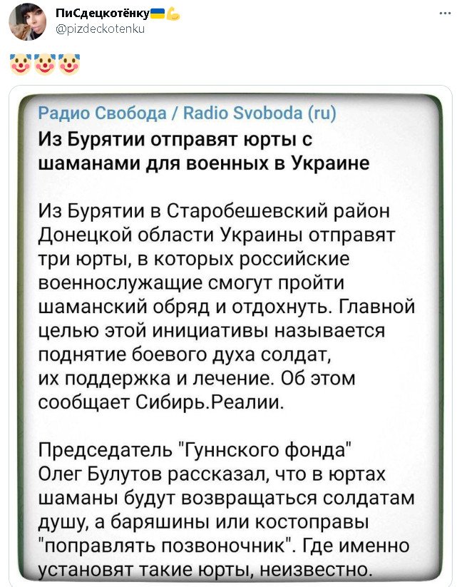 Заебали вы уже до икотки фтарая армия мира. Сидите молча в оркостане и молитнсь, что бы мясом в Украину не отправили.