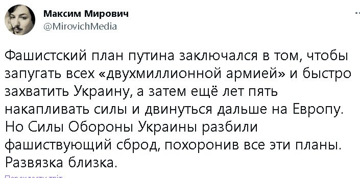 Если б такие пидары как ты ,не влезли в Украину,то и войны здесь не было б ,подожди скоро вас пидаров всех поубивают,и настанет мир.