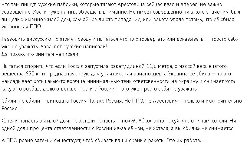 Ты внимательно послушай о чем там речь. А потом ерунду всякую пиши.olegas19 писал(а): ↑Вс янв 15, 2023 7:15 pmПипец ты трепло )) Советник офиса украинского президента Алексей Арестович признал, что приземлившаяся на жилой девятиэтажный дом в Днепре ракета была сбита системой противовоздушной обороны Украины.