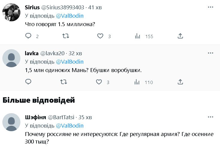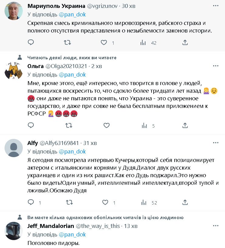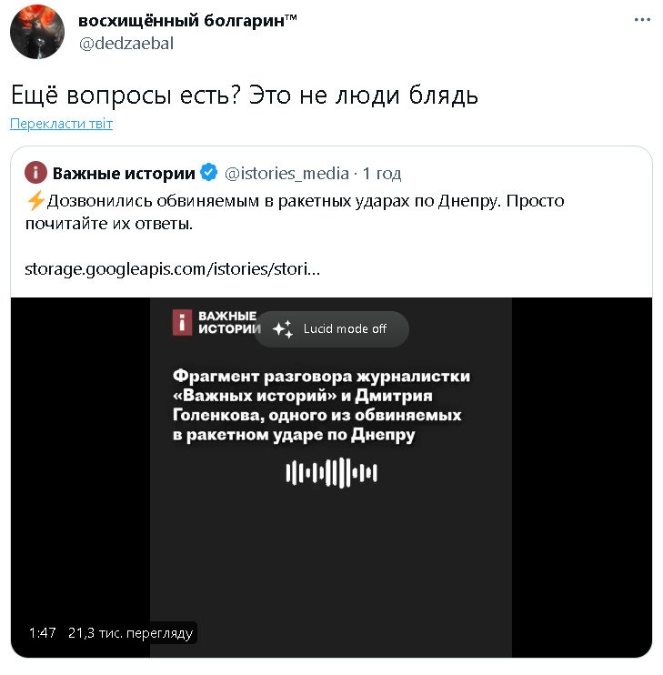 1. руZкий (хоть тьі и неруZкий) всегда врет. Потому что Арестович (тьі же о нем?) такого не говорил. он сказал о вероятнм поражении твоей х-22 средствами пво. и тебе вопрос - что делала х-22, предназначенная для неизбирательного поражения огромной площади (море) над городом Днепр? имеетзначение то, что вьі пускаете ракетьі по нашим городам, а не то, что мьі их сбиваем. ровно как за все жертвьі на Донбассе отвечает тот, кто устроил войну. кто прикрьівал кровью Донбасса захват Крьіма - роZиянская фашистская педерация.gory писал(а): ↑Вт янв 17, 2023 5:33 pmСтранно как-то. Советник же вашего же президента на весь мир объявил что в дом попала ракета Ваших ПВО .