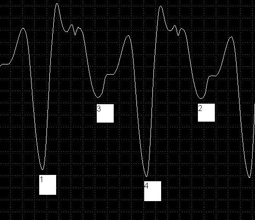 Вот имеем такую осцилограмму разрежения во впускном коллекторе при прокрутке стартером. Автомобиль ВАЗ2107. Снято стандартным датчиком разрежения из комплекта USB Oscilloscope.