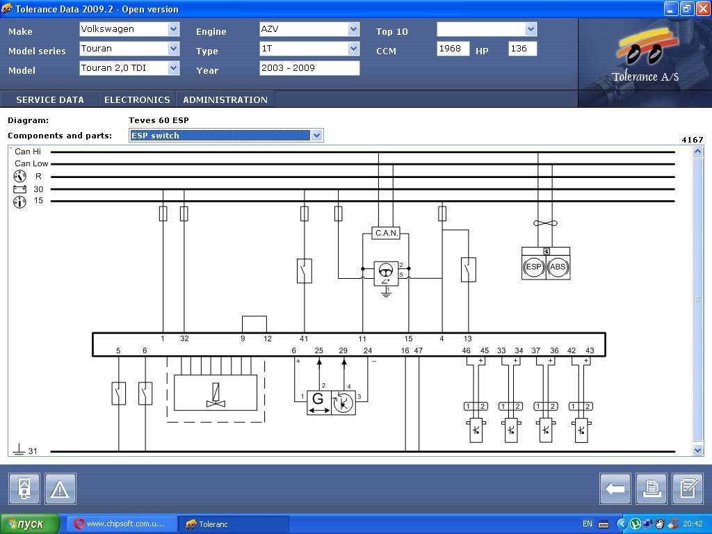 Volkswagen Touran 2.0 TDI 2006 год выпуска, ошибка 01435 в тормозной системе.Лампа АВS не горит, но по словам владельца оный не работает, ЕSP не работает.Думается по вине датчика давления тормозов.