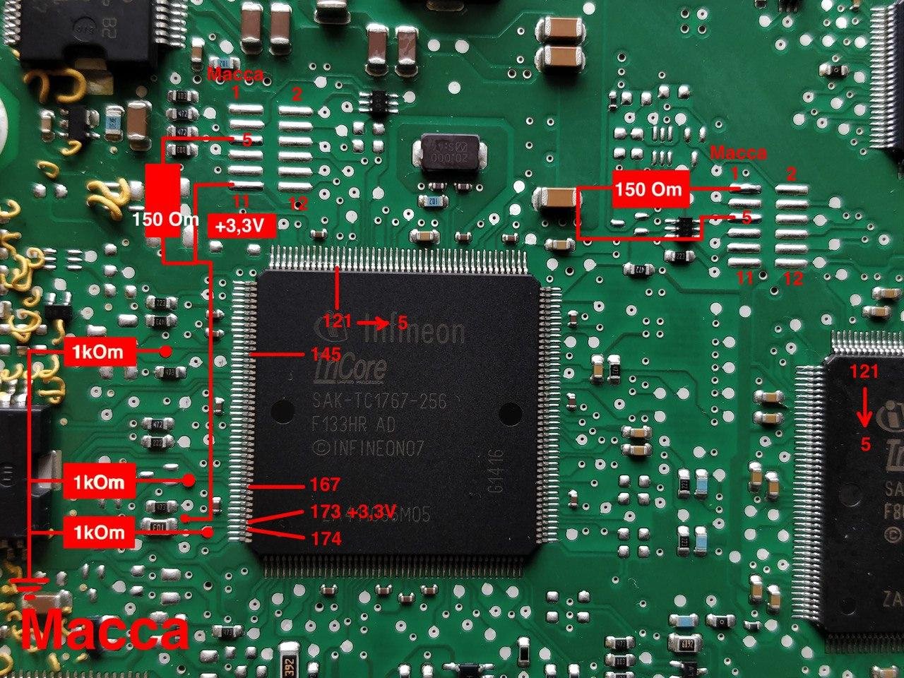 Столкнулся с проблемой перевода в бут SIM2K-240 KIA. Т.е. в бут блок переводится с надцатой попытки. Если для мультифлешера это не является проблемой , то для чиплодыря ситуация патовая. Он требует отключения и включения питания в процессе работы с флеш. При передергивании питания проц не входит в бут и лодырь вываливается с ошибкой. Пришлось найти причину такого поведения проца. У меня блок с автомата и на нем два проца. Задача подвесить коробочный и работать с проциком двигателя. В блоке стоит контроллер питания ATIC112. Он формирует сигнал ресет и по этому же пину выводит сработку WDT (ватчдог таймер). На сервисных площадках по мануалу (-ам) установлены два резистора по 100-200 Ом. Один на массу (коробка), второй на +3.3в. Если с коробочным все понятно (вечный ресет), то с движком нарисовалась проблема. Из-за подтяжки сигнала на +3.3в нет сигнала #PORES (павер он ресет, сброс при подаче питания). По этому происходит лоторея перевода проца в бут. Или переведется, или нет. Я собрал "схему" с конденсаторной задержкой. Проверил. Все работает , как часы. Прилагаю минихелп со схемой. На фото платы не указан резистор по 145 ноге и резистор на 100 Ом сервисной площадки коробочного проца (за кадром). И да, если у вас эта проблема не возникала, то это не значит, что ее нет. Мой знакомый именно с таким блоком в свое время тоже натрахался. Возможно это распространяется и на другие типы блоков. Я не знаю... ЗЫ: Я делал клон блока есси что...