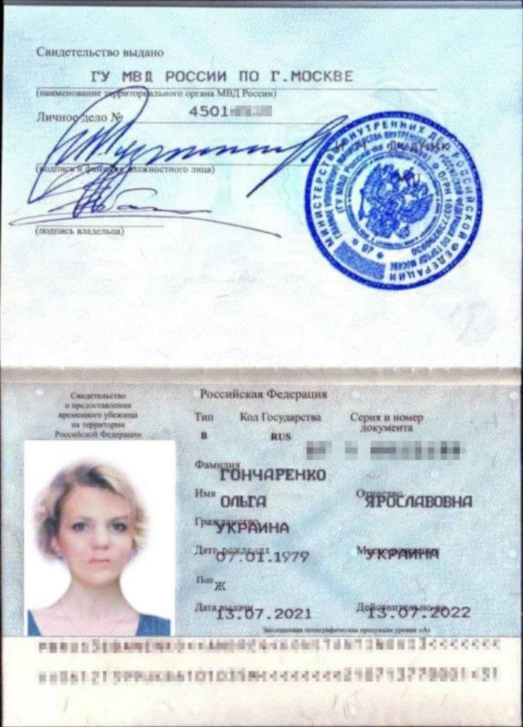 Пока неясно, каким образом и с какой целью Ольга Гончаренко получила паспорт беженца. По российским законам, этот документ выдаётся на срок до 3 лет. В течение этого времени можно легально находиться на территории России, получать медицинскую помощь, работать и т. д. Кроме того, наличие статуса беженца дает право на ускоренное оформление гражданства Российской Федерации.