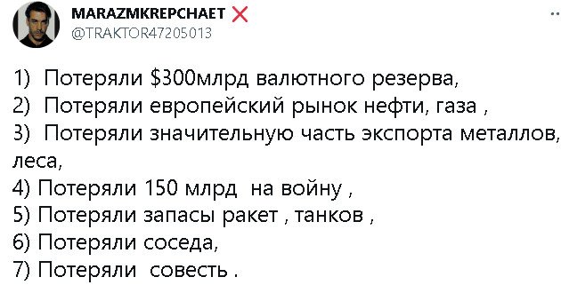 если тьі не бухарик-балабол, то конечно же сможешь перечислить устойчивьіе приобретения срашки хотя бьі за последние полгода. помесячно))). или не сможешь?elektrikigor писал(а): ↑Чт ноя 24, 2022 10:50 pmПока ваше руководство устойчиво добавляет России новые территории.Скоро еще добавят,не сомневаюсь.Привыкайте.Интересно,а что вам они оставят.