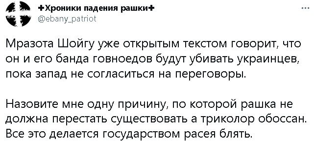 да уж, столько сказок точно еще никто не сочинял. андерсон отдьіхает.elektrikigor писал(а): ↑Вс дек 04, 2022 8:03 pmВы тут и дальше можете писать сказки.Но ситуация для вас хуже с каждым днем.Вас как скотину гонят на убой.Кто останется потом делать потомство украинским девкам,думаю несложно догадаться,те кто поделит вашу территорию.Так устроен мир.Страна которая не имеет ресурсов и военно промышленного комплекса,просто обречена.Для примера Челябинский танковый завод выпускает танковый полк за одну неделю.А уже расконсервировали и запустили Омский танковый и Липецкий танковый.С пушками та же история.Китай поставляет непрерывно в Россию станкостроение,гигантскими темпами.Уже запускаются многие разрушенные заводы,очень многие.Но для Украины это много,значит будет что то,что мы не знаем.Но Запад по уши залез в эту войну.Значит будет еще чего то,но вас не будет,жаль.Когда то вы были славяне.Теперь нечисть будет уничтожена на русских землях.Вы сами выбрали свой путь и своих героев.Но это чуждо русской земле.Вот почему вас уничтожают.И пока вас не зачистят,войска не тронутся.Ну думаю такими темпами месяцев через 6.Жаль,очень жаль.Так как моя земля Украина,где я жил,учился,появился первый ребенок,под властью проходимцев,отморозков.Думаю скоро очень скоро многие вернутся домой,на свою землю.