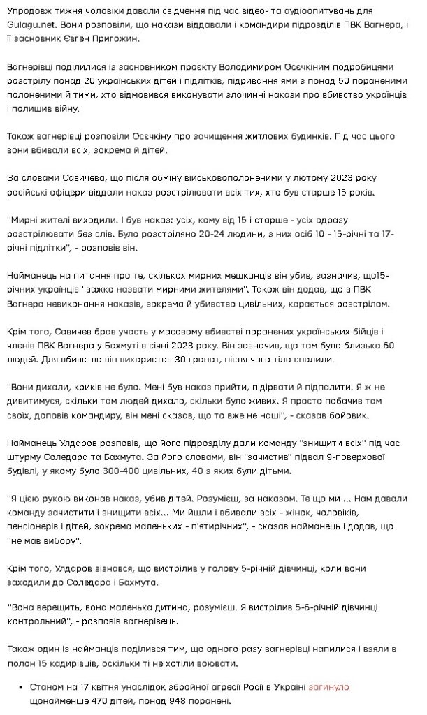 Помилованный указом Путина бывший зек-вагнеровец рассказал, что после февральского обмена пленными между РФ и Украиной в районе Бахмута, когда уехали журналисты, он с сослуживцами получил приказ сесть в засаду. «Мирные жители выходили. И был приказ: всех, кому от 15 [лет] и выше — всех сразу расстреливать без слов. Было расстреляно 20-24 человека, из них человек 10 — 15-летние и 17-летние подростки».