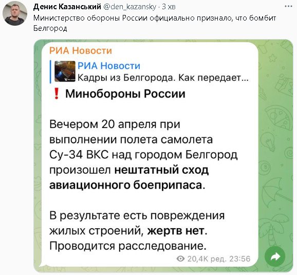 Уже попробовали, как ты и хотел.Все по домашнему. Блетгород очень доволен проведенной операцией. Продолжаем. И какой то хрен со страха припарковался в не положенном месте, на крыше пятерочки? Когда вы уже научитесь не нарушать ПДД?IgorEtalon писал(а): ↑Ср апр 19, 2023 1:11 pmСовсем плохо дело.Напалм грузят в самолеты.Скоро применять значит будут.Бомба ЗБ-500.