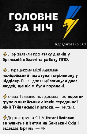 Есть тут интересная информация.В случае повреждения еще раз Крымского моста,то будут уничтожены гиперзвуком все мосты через Днепр полностью,включая и плотины.Левобережной группировки ВСУ придет кирдык.Сообщений ноль.Водная гладь и летающие русские ракеты и Гераньки.Полная изоляция и уничтожение на левобережье.