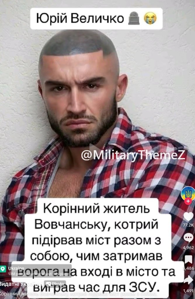 "В украинском тик-токе сейчас активно распространяют публикацию про одного героя - пана Юрия Величко, - пишет Military Theme Z, - жителя Волчанска, который пожертвовал собой и подорвался вместе с мостом на въезде в город во время наступления ВС РФ, выиграв время для ВСУ. В комментариях все плачут, ставят свечки и пишут что "мы, украинцы, недостойны такого человека!".