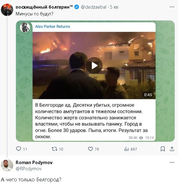 Обстрел Белгорода по телику идет по полной.Нужно поддерживать градус ненависти и войны по телику.КВАРТАЛ-95 тут очень помогает.Главное вовремя не сбивать,когда надо.Короче исходя из местных утюгов,с вами все будет очень хорошо.