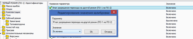 В данном двухрежимном модуле имеется возможность из серийной прошивки (калибровок) сделать двухрежимную. Для этого необходимо изменить одну калибровку в "Опциях" и одну в "Комплектации" в обоих частях на бензине и на газу (ПО-1 и ПО-2). На скринах показано. Причем в комплектации это основная калибровка.vartan писал(а):Как осуществляется переключение режимов? Насколько Я знаю переключение осуществляется в управляющей программе?