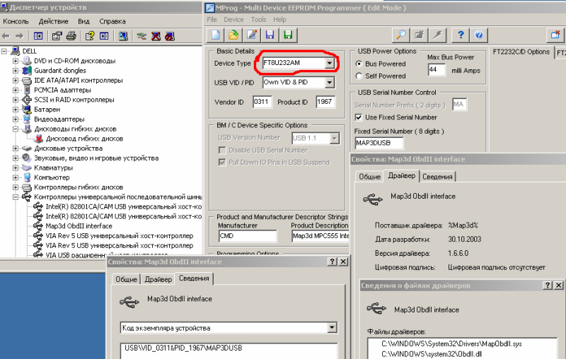 Не хотят работать BDM-ы с FT232RL.На ВМ работает.Mprog видит RL-ку вот так,как на рисунке.Едит епром прописывает юзерарию,но говорит,что "не известный девайс".ФТпрог вообще посылает подальше..."Бьюсь,как рыба" вторые сутки.На другом компе работает.Файлы из system32 и drivers удалял физически.Утилитку очистки натравливал.Реестр чистил.Поставил 2.8.14 драйвера.Если прописать видпид 0403 и 6001,то не ругается,но и не работает.