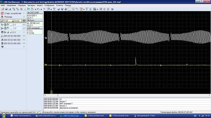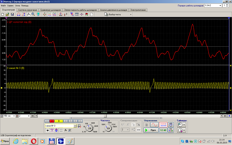 Доброго дня. Автомобиль на холодную(до 60 градусов) имеет стабильную , хорошую работу. На авто стоит ГБО 4-го поколения, характерный трабл возникает как на бензине так и на газу. Трабл в том, что при температуре около 50-60 градусов ХХ становятся не стабильные вплоть до остановки двс (не всегда), если перегазовать, на время ХХ становятся более менее стабильные. Параметры - ни чего сверхъестественного, увеличенное давление в коллекторе, подсос исключен, ПХХ работает исправно, ДПДЗ в норме. ДК не имеет правильную синусоиду, но реакция при отключении отсутствует (изменений нет). Топливо в норме.Форсунки в норме. Сделал тест Шульгина и увидел вот такую картинку. Не понятную картину обвел. Что это? ДПКВ или задающий диск и почему трабл возникают не сразу, а после поднятия температуры?