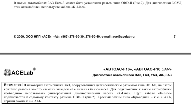 Для подключения к автомобилям ЗАЗ Евро-3 оснащенным разъемом OBD-II рекомендуется использовать универсальный диагностический кабель "K-Line 24", так как в некоторых моделях автомобилей производства ЗАЗ на 5-м контакте диагностического разъема OBD-II вместо "массы" автомобиля выведен "+" питания бензонасоса.