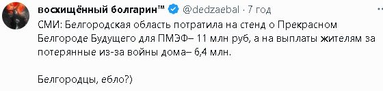 Белгородская область потратила на стенд для ПМЭФ вдвое больше, чем на компенсации жителям за потерянные в результате войны домаВ 11 млн рублей обошелся белгородским властям стенд для презентации «процветающего» (судя по иллюстрациям) региона на Петербургском экономическом форуме. Это следует из данных сайта Госзакупок (https://zakupki.gov.ru/epz/order/notice ... d=14705801), заметил «Можем объяснить».