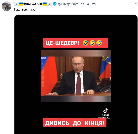 Поздравляю сегодня ВСУ поразили впервые что то важное.Штаб ЧМ!!!!!!Поздравляю.Это было единственное проукраинское место во всей спецоперации.Уже начались должностные уволнения,как ненужных.Половина штаба это бывшие ВСУ,ваши наверно типа предатели и разведчики.Поздравляю ВВП начал законные репресии.