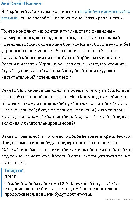 «Если вы посмотрите на учебники НАТО и на математику, которую мы изучали, четырех месяцев должно было хватить нам, чтобы дойти до Крыма, воевать в Крыму, вернуться из Крыма и снова входить и выходить», заявляет военный. После этих слов автор статьи подмечает, что вместо похода до Крыма ВСУ увязли у Артёмовска и на Запорожском направлении, где западная техника уничтожается артиллерией ВС РФ. Просчитался Залужный, но где?