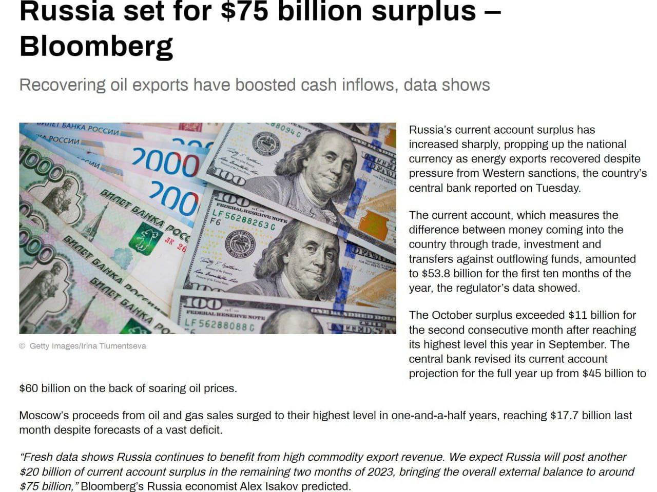 «Россия — самая "подсанкционная» страна в мире — завершит 2023 год с прибылью в 75 миллиардов долларов" - Bloomberg.