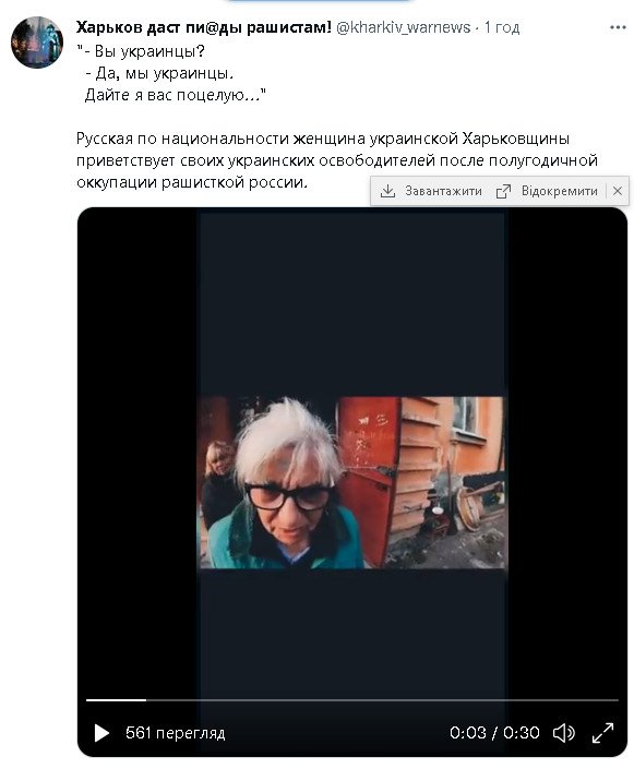 Русская по национальности женщина украинской Харьковщины приветствует своих украинских освободителей после полугодичной оккупации рашисткой россии.