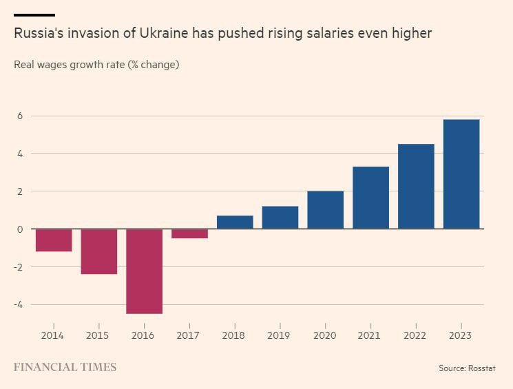▪️По мере того как конфликт затягивался, растущие зарплаты в бурно развивающейся оборонной промышленности вынудили гражданские предприятия не отставать. Без этого невозможно привлечь работников в период нехватки рабочей силы.