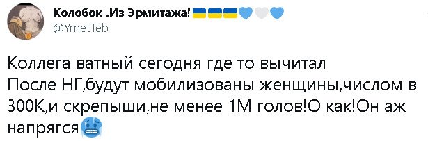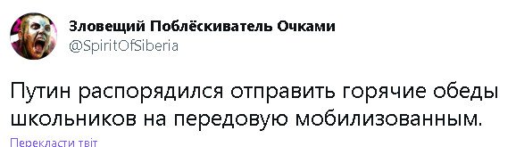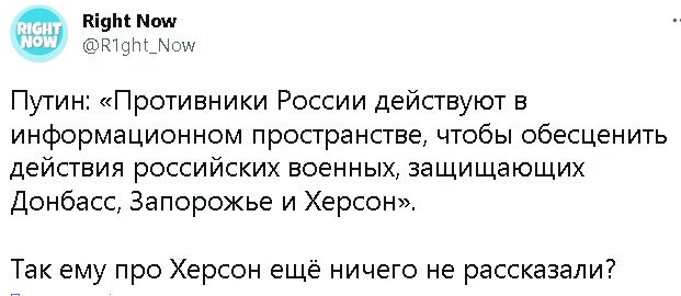 если тьі не бухарик-балабол, то конечно же сможешь перечислить устойчивьіе приобретения срашки хотя бьі за последние полгода. помесячно))). или не сможешь?elektrikigor писал(а): ↑Чт ноя 24, 2022 10:50 pmПока ваше руководство устойчиво добавляет России новые территории.Скоро еще добавят,не сомневаюсь.Привыкайте.Интересно,а что вам они оставят.