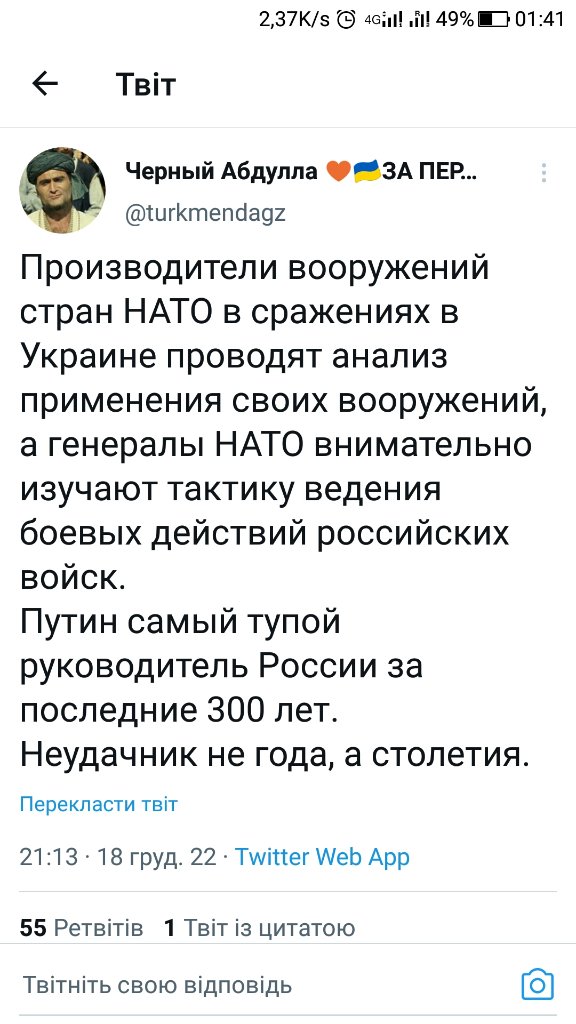 Чет ваши военкоры с полей пишут, что нифига нету, связь как была аналоговой, так и осталась. Ланцеты типа хорошо, но очень мало. Солдаты и офицеры не понимают, за что воюют. Большинство в открытую ржет с пенсионеров уже. А ты пишешь, что все хорошо. Но, наверное, больше хорошо у пенсионеров ваших, а не у солдат. Как там армата и СУ-57? А Ратник? У каждого уже бойца? Ну и конечно, западное оружие не эффективно, ваши пацаны из Изюма и Херсона не дадут соврать. Нарышкин там ещё не уволен? Это же он докладывал, что за 18 часов Киев будет в окружении? Разведка у вас на высоте, что есть, то есть.