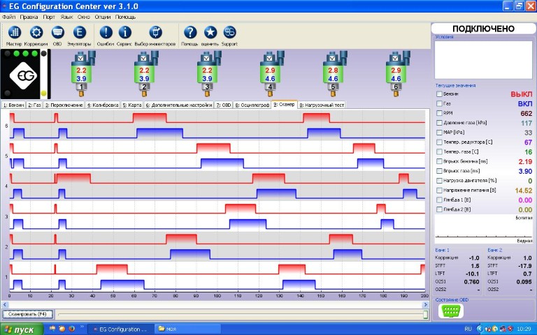 На показания в верхней и правой части программы просьба не обращать внимание ни на одном рисунке потому, что пока сохранял осциллограмму двигатель уже переходил на ХХ.Robin писал(а):Ну первое, что проверить - правильно ли подключены форсунки