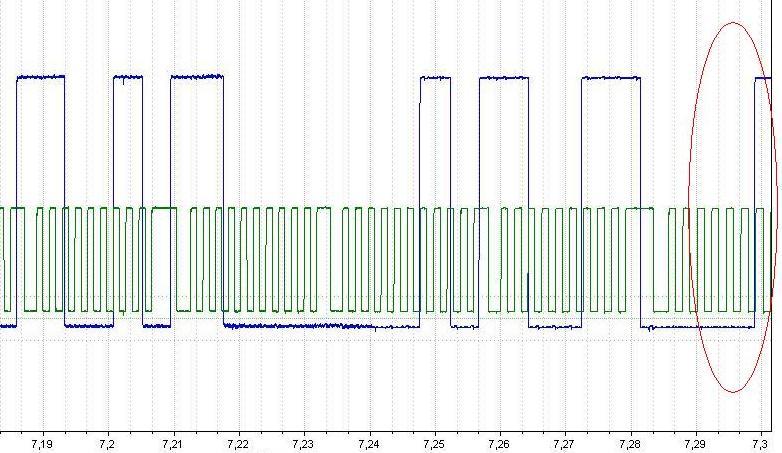 Спасибо, очень помогло сравнить со своей, по импульсам одинаково, а вот похоже сдвиг по фазе есть зуба на 3. Вот моя снятая в режиме МТрro, посмотри, пож, может я не прав. И вот нашёл образцовую осцилку, если перевернуть сигнал ДФ на моей - совпадает, ну может один зуб КВ не пляшет, чему верить? Там метки проверить - разобрать пол-мотора....