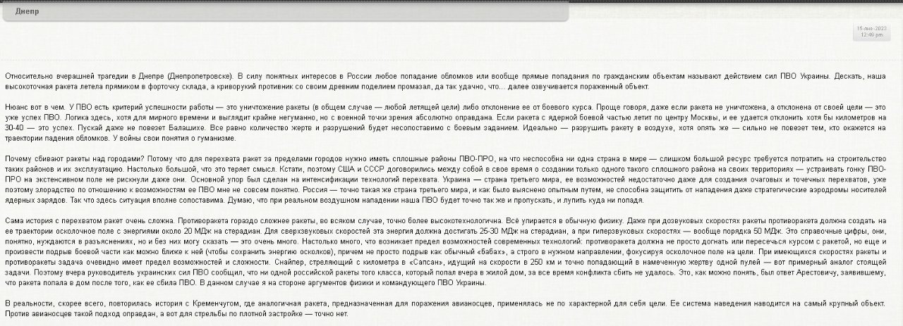Ты внимательно послушай о чем там речь. А потом ерунду всякую пиши.olegas19 писал(а): ↑Вс янв 15, 2023 7:15 pmПипец ты трепло )) Советник офиса украинского президента Алексей Арестович признал, что приземлившаяся на жилой девятиэтажный дом в Днепре ракета была сбита системой противовоздушной обороны Украины.