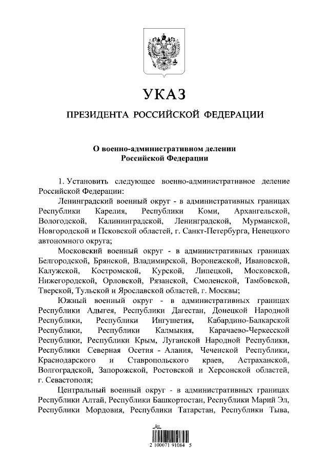 Владимир Путин сегодня подписал указ о военно-административном делении России. Воссозданы Московский и Ленинградский военные округа. Также появились военные округа Донецкой Народной Республики, Луганской Народной Республики. Округа Запорожской и Херсонской областей. Все они включены в Южный военный округ России.