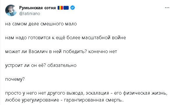 Политические хохлы своими танцами в чёрных пакетах, отрезаниями яиц пленным, беспилотниками и обстрелами Белгорода сделали максимум возможного для того, чтобы русский народ приобрел необходимый уровень мотивации и готовность защитить свою Родину исторически проверенным способом - разрушив столицу врага, уничтожив миллионы его солдат и отодвинув границу на несколько тысяч километров от внезапно ставших прифронтовыми Курска и Брянска.
