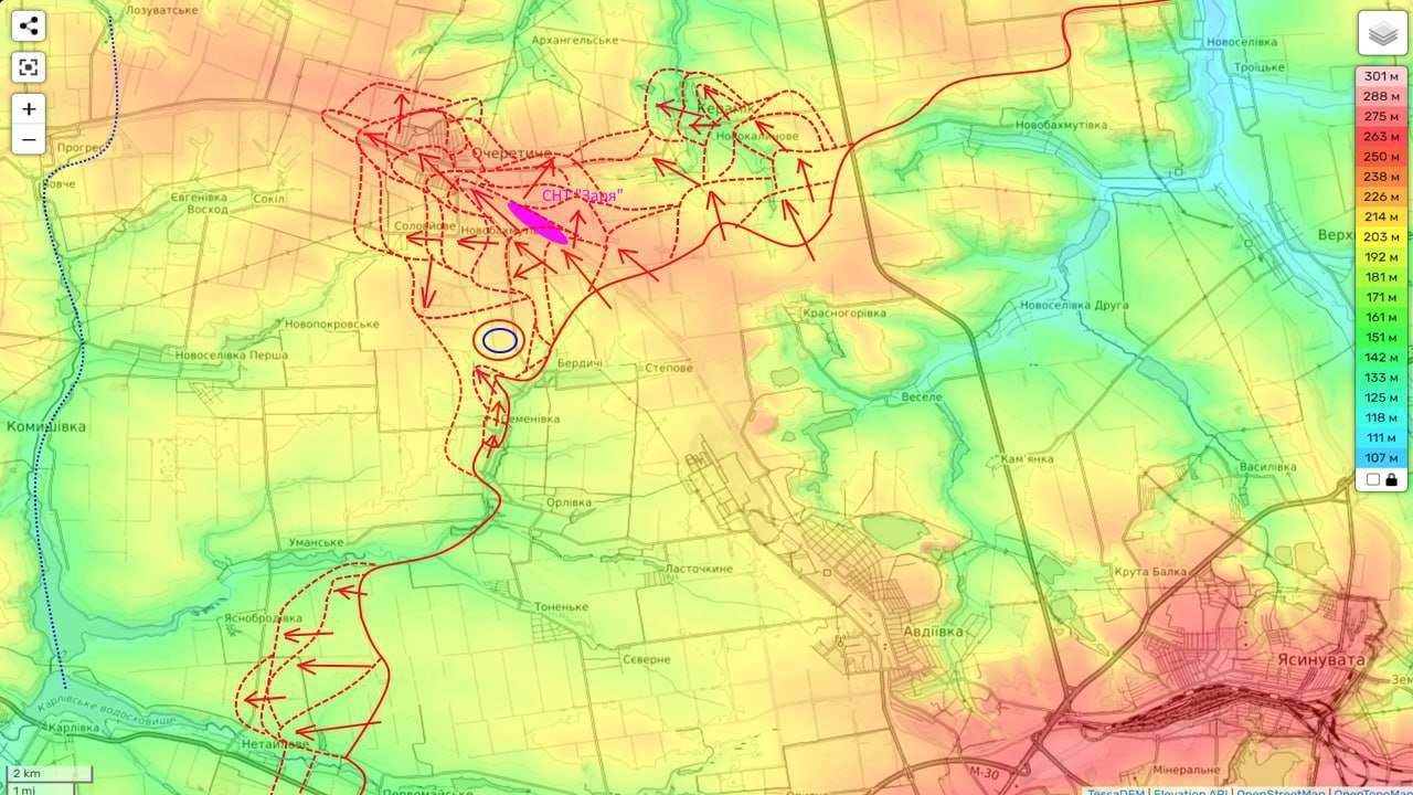 Немножко карты б.д. в районе Авдеевки.Как видно идет захват высот и потом полный контроль низин.Их потом и так оставят.Вырисовывается небольшой котел между двумя наступающими группировками и он будет в низине,там одни поля и лесопосадки.Только маразматики там останутся.