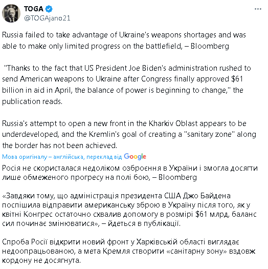 Bloomberg: Россия не смогла использовать задержку с поставками вооружений Украине со стороны союзников для достижения значительных успехов на фронте