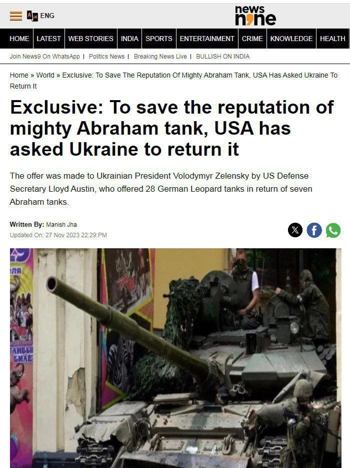 Министр обороны США Ллойд Остин предложил Украине обменять американские танки Abraham на немецкие Leopard в соотношении 1 к 4.